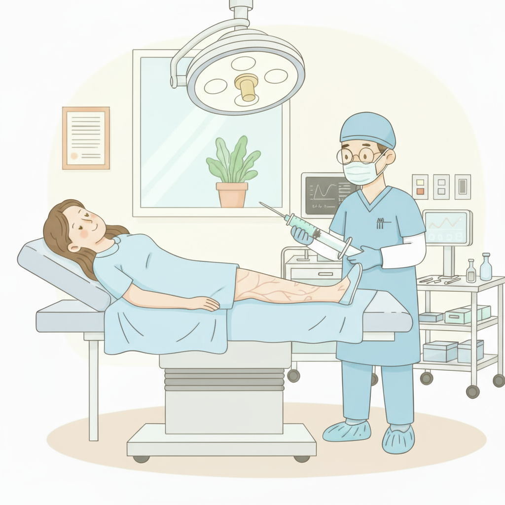 - В просвет вены вводится специальный препарат‑склерозант, который «склеивает» стенки сосуда. Со временем вена рассасывается. Используется, если есть сосудистые звёздочки, мелкие варикозные узлы, телеангиэктазии.