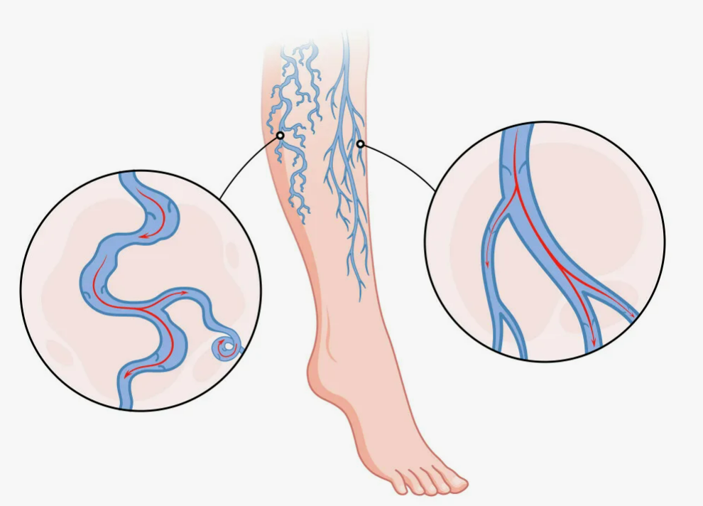 - Варикозная болезнь— расширение и деформация вен из-за нарушения работы венозных клапанов. Проявляется видимыми извитыми венами, тяжестью в ногах, отёками.