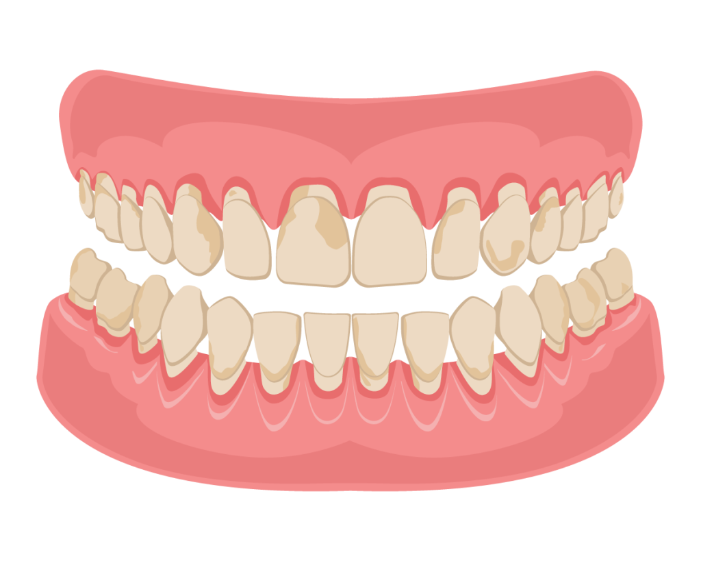 - Глубокая атрофия десен и оголение шеек зубов.