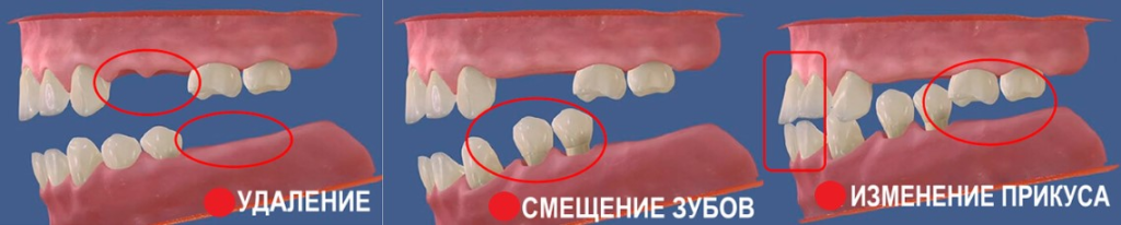 - Возможно смещение соседних зубов в сторону освободившегося пространства, приводящее к деформации зубного ряда и изменению прикусовых соотношений. Последствия могут включать патологическое стирание твёрдых тканей зубов и деструкцию пародонта.