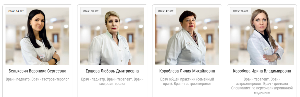 Прием ведут врачи-гастроэнтерологи Белькевич Вероника Сергеевна, Коробова Ирина Владимировна, Ершова Любовь Дмитриевна, Кораблева Лилия Михайловна.