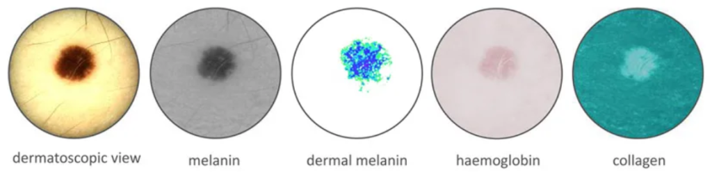 - Передача изображения на компьютер: Отраженный свет улавливается датчиками сиаскопа и передается на компьютер. Прибор делает пять «моментальных снимков» кожи — сиасканов. Первый дает увеличенное изображение родинки, второй — сосудистый рисунок новообразования, третий — расположение поверхностного меланина, четвертый показывает глубокий меланин и пятый — коллаген.